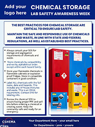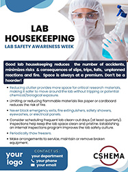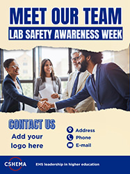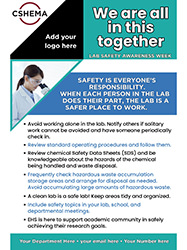 Successful laboratory safety awareness and programs can help identify and manage laboratory hazards before they cause injury. Participating in CSHEMA Lab Safety Awareness Week can help get your awareness programs started, boost one that already exists, or highlight your safety successes.