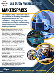 Elements of safety-by-design, user training, and strategies for monitoring and access control are essential for makerspace safety.